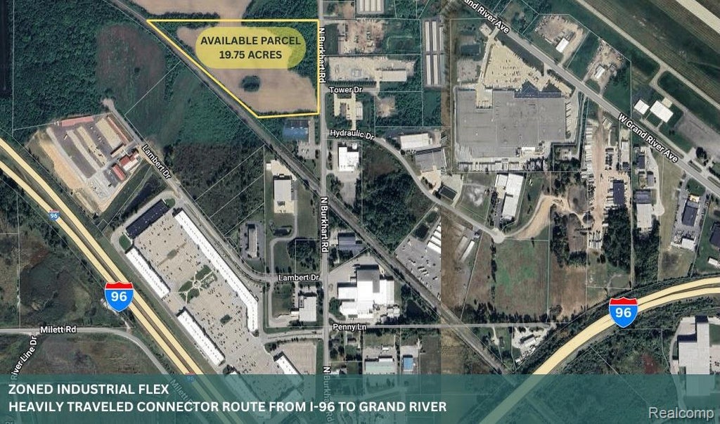 19.75 Acres perfect for Industrial and Warehouse Distribution. Current Zoning is Industrial Flex. Important to know the location is next door to the Kensington Outlet Mall with visitors locally and far distances, averaging more than 3.5 million visitors per year. The site is located 1 mile west of Downtown Howell. This is a heavily traveled connector route from I-96 to Grand River, class A all-weather state road. No wetlands or environmental issues. All utilities in place. Concept plan put together for self storage. Broker Owned.