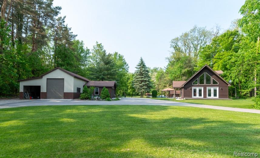 A-frame Home with Pole Barn that includes 600+ sqft. of additional finished living space on 5 picturesque acres! Enjoy your own private oasis with the heated in-ground pool, a garden area, and multiple storage sheds for all your outdoor needs. The Pole Barn is heated with 12-ft ceilings (large enough to fit a semi-truck), 220 power, and an attached carport which could easily be finished off with doors. Connected to the Pole Barn is additional finished living space: including a half bath, second kitchen/bar area, and open living space all in knotty pine. Great space for guest quarters or just additional living flex space: foam-insulated, heated, includes a window AC unit, and features ceramic tile flooring with radiant heat. Combined, the house and flex space are approximately 2035 sqft & the entire property is efficiently heated by a wood boiler system that heats the home, garage, flex space and even the pool! Additional highlights include new furnace and A/C (2023), composite front deck and gazebo, stamped concrete walkway & patio, paved driveway, and newer exterior doors. Acreage is 50% wooded with trail, two food plots, and two ground blinds—ideal for nature lovers and hunters alike. Whether you're looking for a full-time residence or a year-round vacation home, this property has it all wrapped into one spectacular package!