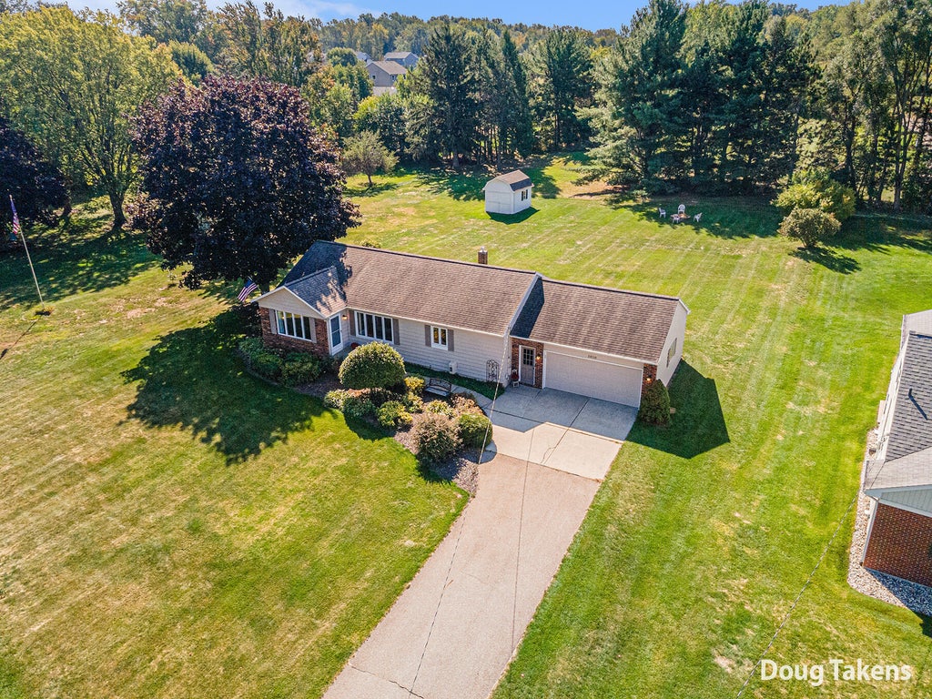 Welcome to a mint condition ranch home in the Award-winning and highly popular Byron Center Public Schools, resting on a large private lot. The main floor has a kitchen with a snack bar, large eating area, cozy living room with lots of windows and a slider to a deck, 2 bedrooms, and an owners suite with a bathroom. The lower level has a huge family room, large rec room, laundry and storage. Other perks: vinyl plank flooring, 2020 new AC/Furnace, 2018 new roof and water heater, whole house generator, big shed, well for watering, but water and sewer for the house, all appliances and washer and dryer remain, close to major highways, parks, trails, shopping and restaurants, and much more. Open house is 12 30 to 2 pm on 10.11 and offers reviewed at 7 pm on 10.13. Call for a private showing today!
