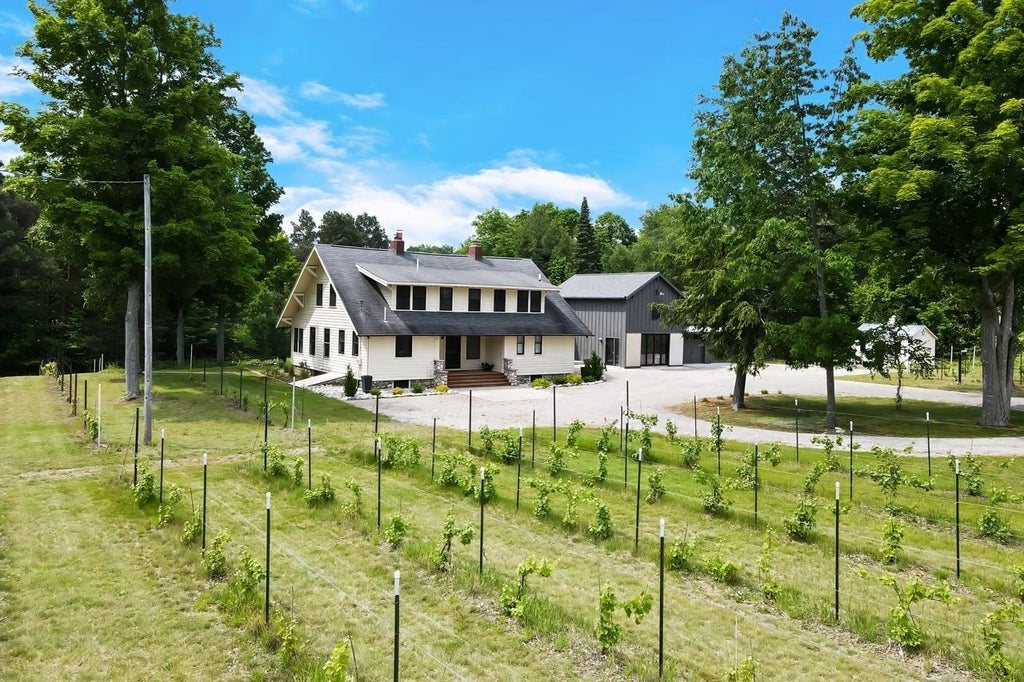 Looking for the best that Leelanau has to offer in one property, that option exists! 2+ acres setting that backs up to NP Village includes vineyards, lavender, & open area to plant or leave natural. This breathtaking Craftsman w/the original architectural beauty intact, has been artfully enhanced w/ a modern 2020 addition to incl. sitting room w/wet bar, concrete flooring, office, basement expansion & attached finished garage w/3 overhead doors + a large breezeway that seamlessly connects contemporary & vintage. The ultimate entertaining house w/ separation for ease of enjoying hosting! The original home features original woodwork, true divided light windows, updated kitchen, wood floors, f/p, elegant dining room w/ built in buffet, heated sunroom porch, beamed ceilings, main floor bd, bath & laundry. Privacy is assured, amazing outdoor space + room for a pool. New 4 bd septic in progress Fall 2025! Flexible floor plan options & room for an easy expansion of baths on the main floor & upper level. Amazing location that backs up to the Village of NP for optimum ease of use, lower taxes, w/ dining, beaches, marina & shopping so close. Great rental potential too! Endless recreational opportunities close by including the Lighthouse, Peterson Park, Golfing, Pickleball, Brewery, tennis, biking & more! Check the events at Northport/Omenachamber.org.