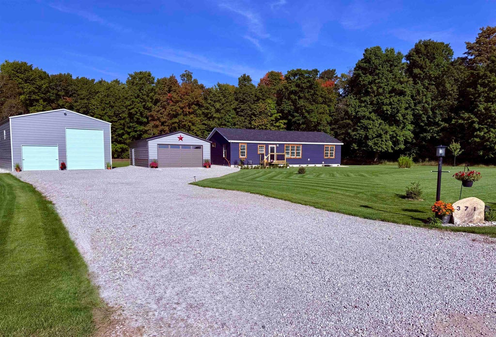 This property will WOW you! Sitting on 2.5 serene acres, this meticulously maintained home offers the perfect blend of comfort, style, functionality, and outdoor beauty. Built in 2021, this 3-bedroom, 2-bath home features spacious living areas and two large porches-ideal for enjoying all four seasons! Inside extras include tray ceilings, solid wood accent walls, a stunning kitchen with butcher block island, a dedicated coffee bar, and darling fireplace, amongst many other customized upgrades. Step outside and discover even more: a detached 22x35 ft garage, a massive 30x40 ft pole barn for all your storage or hobby needs, and a fully finished, Amish made, heated backyard building, perfect for remote work or creative pursuits. The property boasts a lush, irrigated lawn framed by mature woods, offering privacy and a stunning natural backdrop. Take in breathtaking sunrise and sunset views right from your porch-your new oasis awaits!